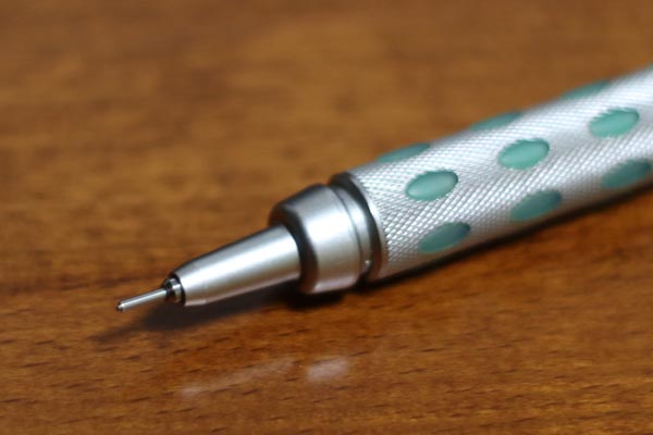 グラフギア1000には、ペン先にパイプガイドがついていて、これが芯を折れないように守ってくれる。先述したように、このパイプガイドはボタン一つでボディの中にしまい込まれるから、移動中の衝撃で折れることもない。芯が折れなければ、イラっとしない。芯が折れなければ、心も折れずに済むというものだ。