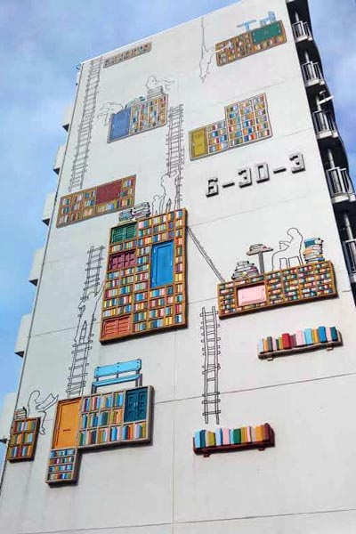 そうして、公民館の近くまで歩いて、お目当ての壁画を眺める。Book climbingと名付けられたその壁画には、立体的な本棚が壁に取り付けられ、壁面に梯子と人が描かれている。