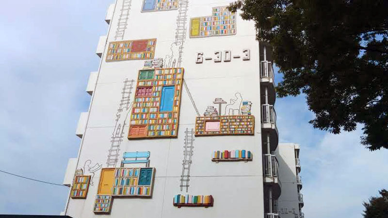 そうして、公民館の近くまで歩いて、お目当ての壁画を眺める。Book climbingと名付けられたその壁画には、立体的な本棚が壁に取り付けられ、壁面に梯子と人が描かれている。