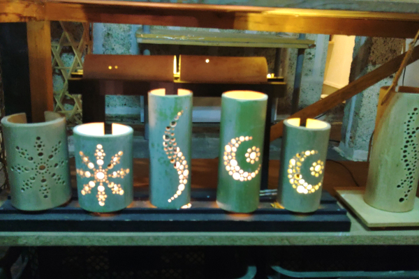 夜の竹林散歩を終えて受付で提灯を返す。受付そばに飾ってあった竹で作られたランプシェードに二人の目が留まる。